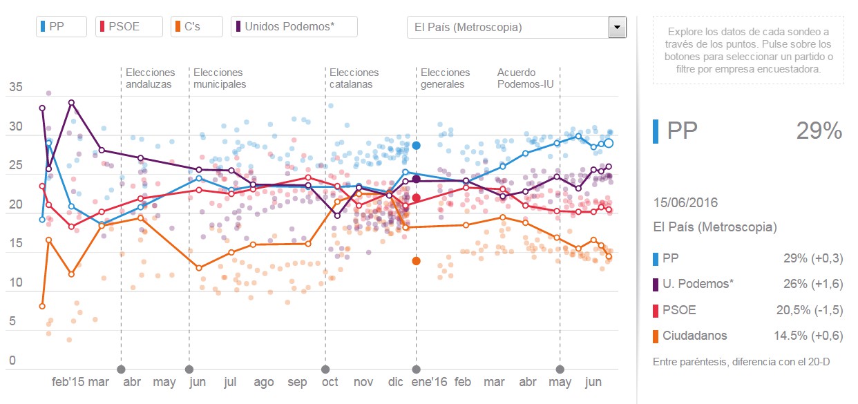 Nuevamente estamos preparados para ejercer el derecho al voto. Hoy es el ultimo día que se puede publicar encuestas en nuestro país. Como paso en las anteriores elecciones, no creo que sea impedimento para poder enterarnos de mas encuestas como por ejemplo la famosa de las frutas y verduras de las anteriores elecciones. Pero por si acaso aquí esta la mas completa y reciente suma de encuestas de las elecciones generales 2016 o si lo prefieres 26-J.
